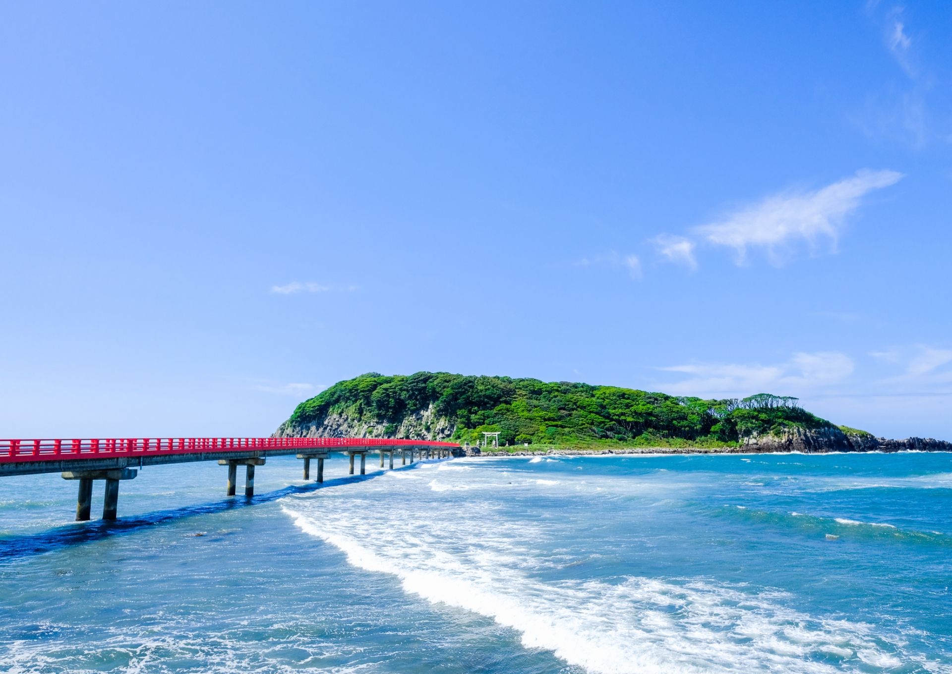 Just off the coast, tiny Oshima Island is accessible by a brightly painted footbridge. The island can be explored in about an hour along a circular walking path. Hidden among the trees, you'll find the main Ominato Shrine, where people pray for safe voyages and abundant catches on the sea. A spectacular view of Tojinbo from the sea is one great reason to make a visit to the shrine.